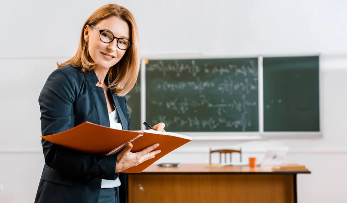 Smiling teacher writing in a notebook in a classroom with a chalkboard full of math equations